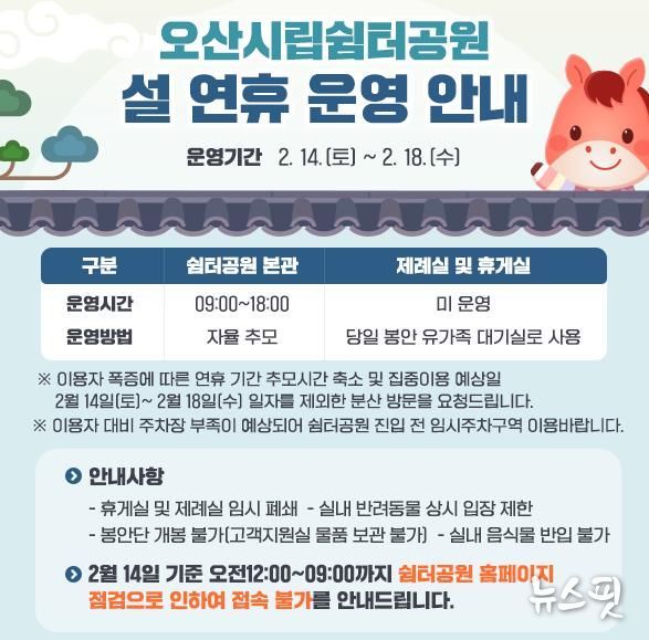 오산시립쉼터공원은 오전 9시부터 오후 6시까지 연중무휴로 운영된다. 다만, 2월 14일(토)부터 2월 18일(수)까지 5일간은 추모객 밀집으로 인한 안전사고 예방을 위해 휴게실 및 제례실은 임시 폐쇄된다. 또한 공원 내 질서 유지를 위해 음식물 반입 및 봉안 물품 안치가 제한되며, 반려동물 동반 입장도 금지된다. 오산도시공사는 이러한 운영 방침을 통해 쾌적하고 안전한 추모 환경을 조성할 계획이다.