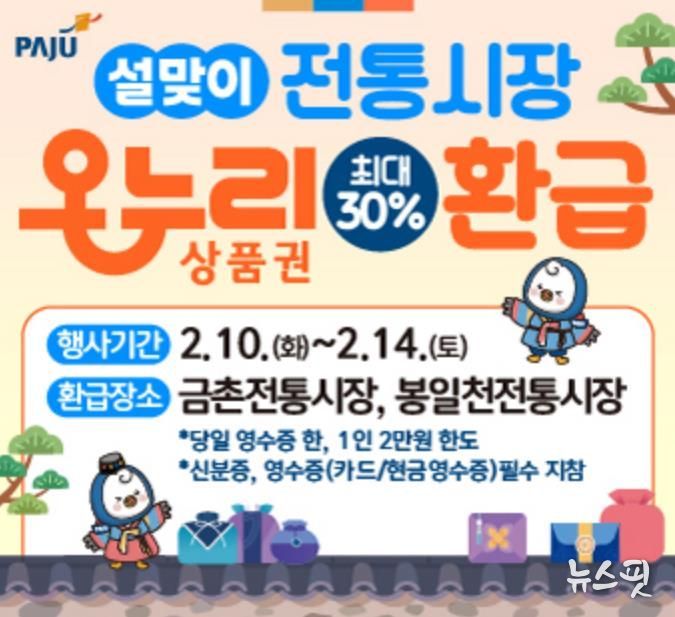 (뉴스핏 = 김호 기자) 파주시는 2026년 설 명절을 맞아 고물가로 인한 시민들의 가계 부담을 덜고 지역 전통시장 활성화를 도모하기 위해 ‘설맞이 농축산물 온누리상품권 환급 행사’를 실시한다.