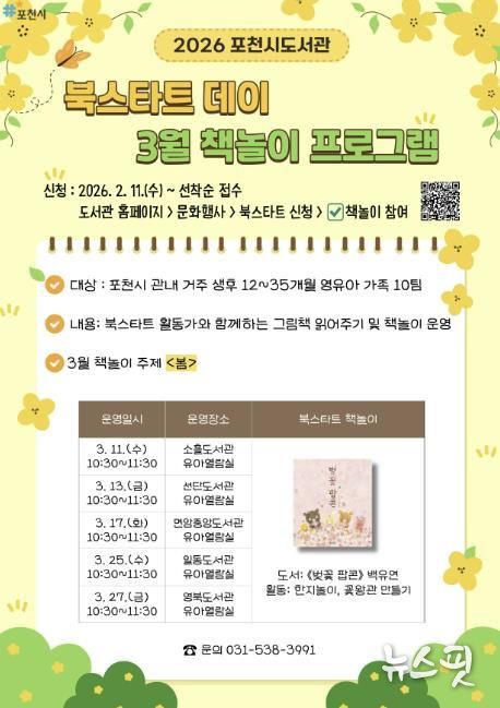 이와 함께 포천시는 오는 3월부터 ‘북스타트 데이’ 책놀이 프로그램도 운영한다. 해당 프로그램은 포천시 도서관 5개소(면암중앙·소흘·일동·영북·선단)에서 관내 12~35개월 영유아를 대상으로 진행된다. 북스타트 활동가와 함께 주제별 그림책 읽기와 연계한 책놀이 활동을 통해 영유아의 정서 발달과 부모·자녀 간 교감을 돕는다.