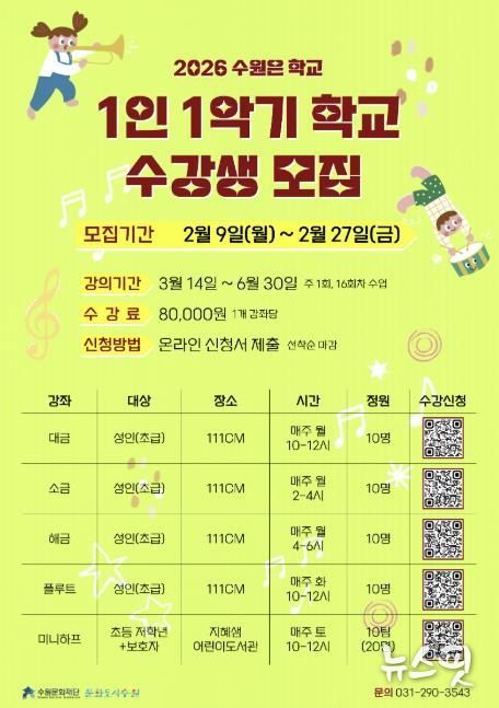 (뉴스핏 = 김호 기자) 수원문화재단이 오는 27일까지 시민 누구나 참여할 수 있는 ‘2026 수원은학교 1인 1악기 학교’ 수강생을 선착순으로 모집한다.