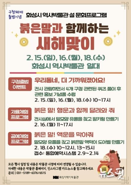 한편, 화성시 역사박물관은 설날 당일인 2월 17일을 제외하고 연휴 기간 내내(15일~18일) 정상 개관하며, 프로그램에 대한 자세한 사항은 화성시 역사박물관 누리집 및 SNS를 통해 확인할 수 있다.