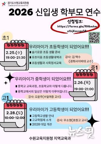 (뉴스핏 = 김수진 기자) 경기도수원교육지원청은 오는 25일부터 28일까지 사흘간 관내 초‧중‧고등학교 입학을 앞둔 예비 신입생 학부모를 대상으로'2026년 신입생 학부모 연수'를 운영한다.
