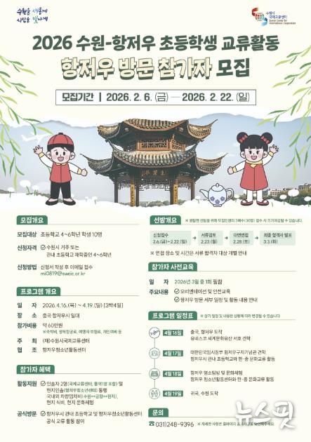 (뉴스핏 = 김호 기자) 수원특례시는 ‘2026 수원–항저우 초등학생 상호방문교류’에 참여할 초등학생 10명을 2월 22일까지 모집한다.