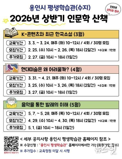 (뉴스핏 = 김수진 기자) 용인특례시는 오는 25일부터 수지구에 있는 용인시평생학습관에서 인문학 산책 수강생을 모집한다고 13일 밝혔다.