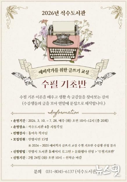 (뉴스핏 = 김수진 기자) 안양시 석수도서관은 문학과 글쓰기에 관심 있는 안양 시민을 대상으로 ‘예비작가를 위한 글쓰기 교실’ 수필 기초반 및 소설 창작반을 운영한다고 13일 밝혔다.