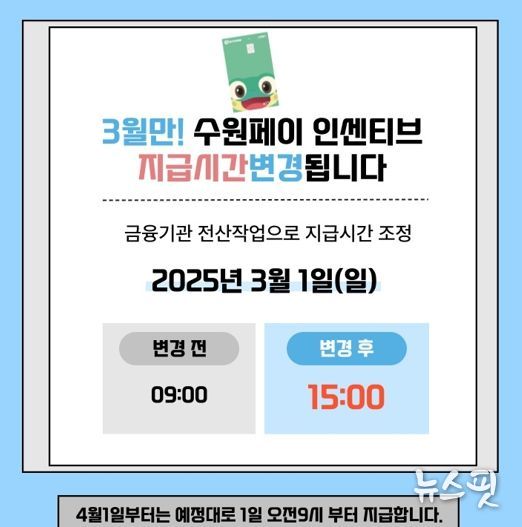 수원페이 인센티브 지급 시작 시각은 매달 1일 오전 9시였지만, 3월 1일 금융기관 전산 작업으로 인해 오후 3시로 늦춰진다. 4월부터는 다시 1일 오전 9시부터 지급한다.