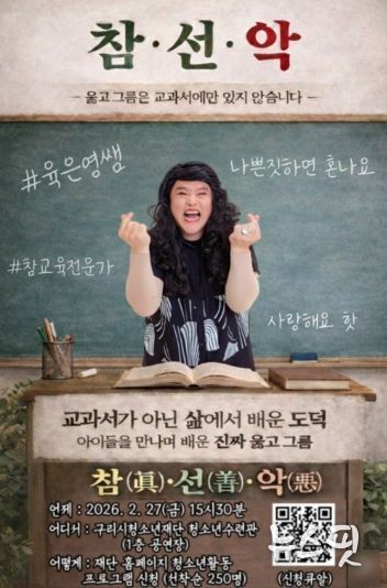(뉴스핏 = 김수진 기자) 구리시청소년재단은 사회공헌활동의 일환으로 인성교육 프로젝트 '유튜버 육은영쌤과 함께하는 ‘참·선·악’ 진짜 나를 찾는 시간' 강연 참가자를 오는 26일까지 선착순 250명 모집한다고 23일 밝혔다.