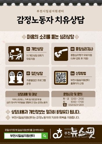 (뉴스핏 = 김호 기자) 부천시여성청소년재단이 운영하는 부천시일쉼지원센터 치유상담실은 감정노동자에게 전문가 개인상담과 종합심리검사 등을 지원한다.
