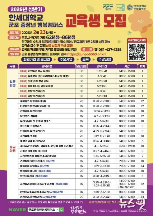 (뉴스핏 = 김수진 기자) 군포시가 인생 2막 설계와 사회참여 확대의 기회를 제공하고자 중장년 세대를 대상으로 2026년 상반기 중장년 행복캠퍼스 교육생을 모집한다고 밝혔다.