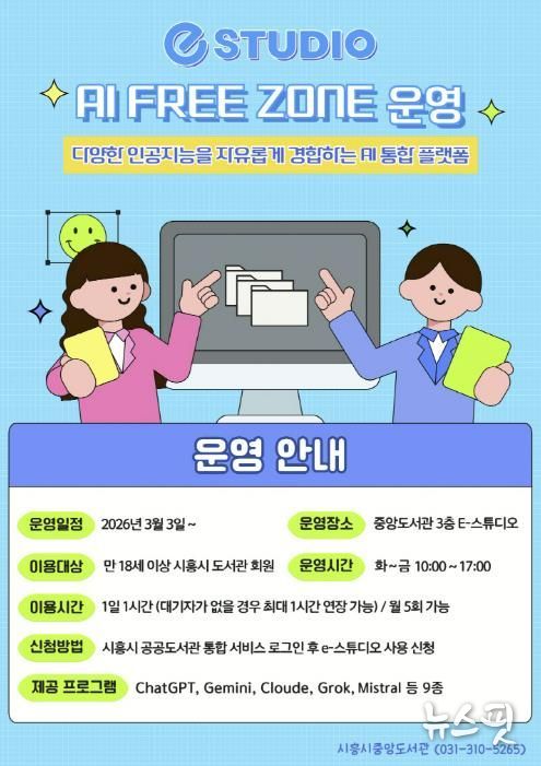(뉴스핏 = 김수진 기자) 시흥시중앙도서관은 시민들의 인공지능(AI) 활용 역량 강화를 위해 시 정보통신과와 협업해 도서관 3층 e-스튜디오에 ‘인공지능(AI) 프리 존(Free Zone)’을 구축하고, 오는 3월 3일부터 본격 운영에 들어간다.