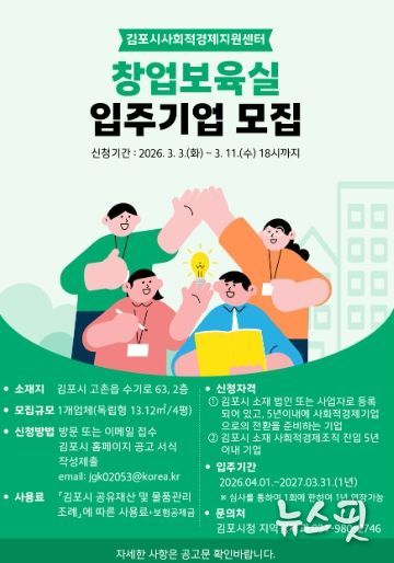 (뉴스핏 = 김수진 기자) 김포시는 사회적 가치를 실현하는 초기 사회적경제기업의 안정적인 운영 및 성장을 지원하기 위해 오는 3월 3일부터 11일까지 사회적경제지원센터 창업보육실 입주기업을 모집한다.