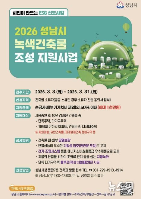 (뉴스핏 = 김호 기자) 성남시는 노후 건축물의 에너지 효율을 높이고 온실가스 배출을 줄이기 위해 ‘2026년 성남시 녹색건축물 조성 지원사업’을 시행한다. 단열재 보강과 고효율 창호 교체 등 에너지 성능 개선 공사비를 최대 1000만원까지 지원한다.