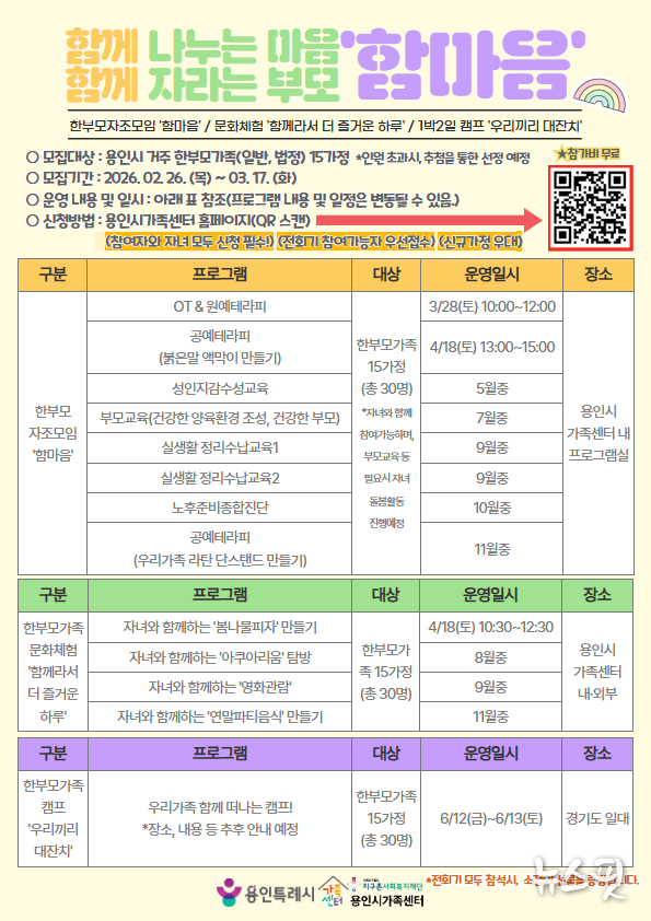 (뉴스핏 = 김수진 기자) 사회복지법인 지구촌사회복지재단 용인시가족센터는 한부모가족의 정서적 안정과 가족 기능 강화를 튀해 ‘2026년 한부모지원 프로그램’ 참여자를 모집한다고 4일 밝혔다.