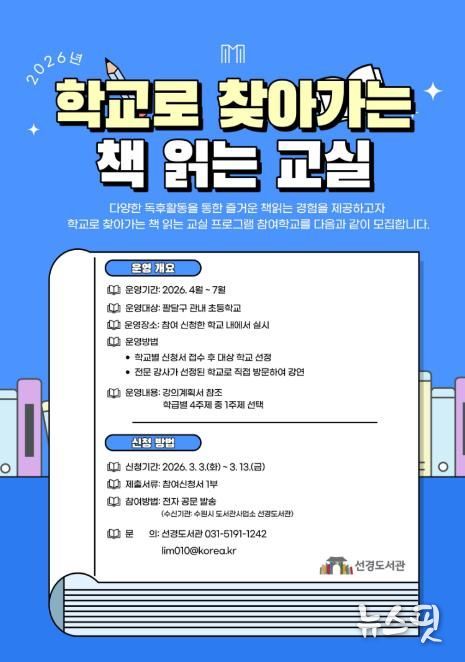 (뉴스핏 = 김호 기자) 수원시 선경도서관은 ‘2026년 학교로 찾아가는 책 읽는 교실’에 참여할 팔달구 관내 초등학교를 13일까지 모집한다.