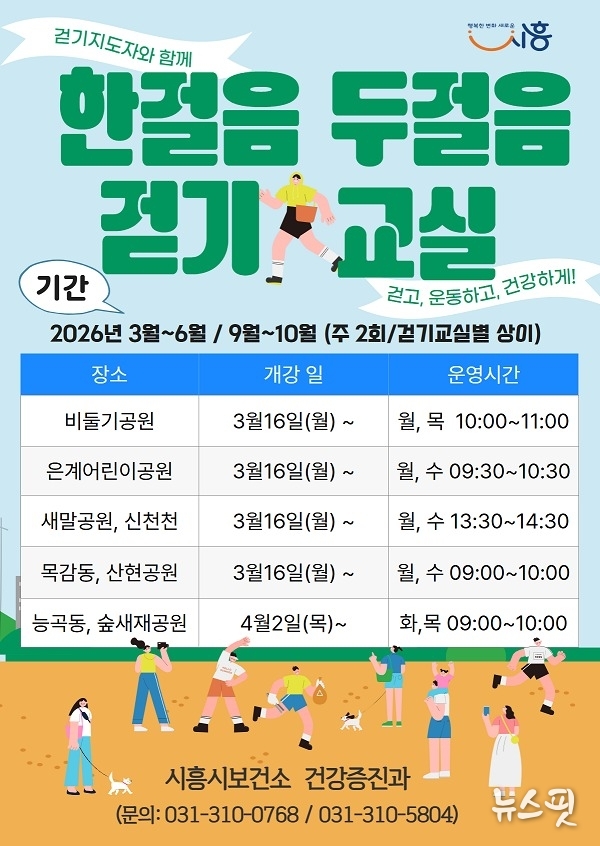 (뉴스핏 = 김수진 기자) 시흥시는 시민들의 일상 속 걷기 실천을 장려하고 건강생활 습관 형성을 돕기 위해 ‘한 걸음 두 걸음 걷기교실’을 운영한다고 5일 밝혔다.