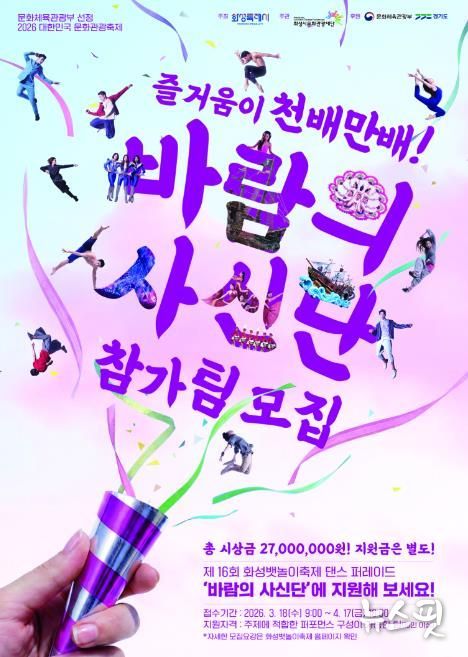 (뉴스핏 = 김수진 기자) (재)화성시문화관광재단은 제16회 화성 뱃놀이 축제의 주인공이 될 ‘바람의 사신단 댄스 퍼레이드‘경연 참가팀을 모집한다.