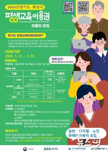 (뉴스핏 = 김수진 기자) 화성특례시는 평생학습 소외계층의 학습권을 보장하고 교육격차를 완화하기 위해 ‘2026년 평생교육이용권 지원사업’ 이용자 1차 모집을 오는 11일부터 31일까지 실시한다고 6일 밝혔다.