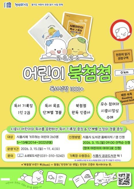 (뉴스핏 = 김수진 기자) 시흥시 소래빛도서관은 오는 15일부터 관내 5~13세 어린이 260명을 대상으로 독서 기록장을 배부하고, 우수 참여자 8명에게 시흥시장상을 수여하는 독서사업 ‘2026 어린이 북쳠쳠 독서성장 1000+’를 운영한다고 9일 밝혔다.