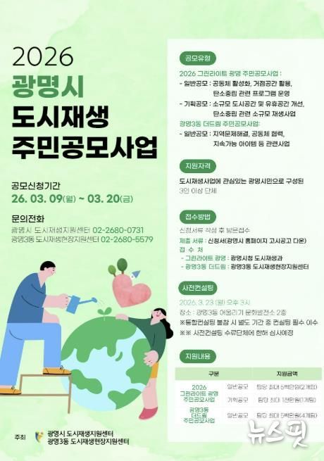 (뉴스핏 = 김호 기자) 광명시가 오는 20일까지 주민이 스스로 마을 문제를 해결하고 공동체 활성화를 이끌어갈 ‘2026년 도시재생 주민공모사업’ 참여단체를 모집한다.