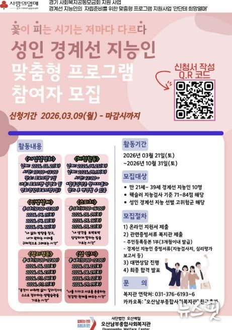 (뉴스핏 = 김수진 기자) 오산남부종합사회복지관은 지역사회 내 복지 사각지대에 놓인 성인 경계선 지능인을 위한 맞춤형 지원 프로그램 ‘꽃·피·다’를 오는 4월 11일부터 운영한다고 11일 밝혔다.