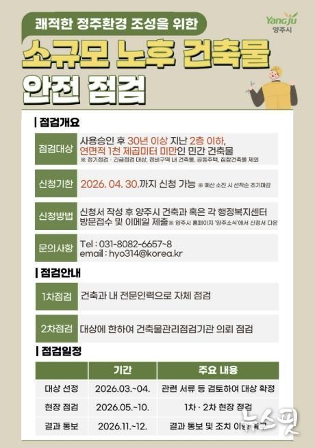 (뉴스핏 = 김호 기자) 양주시가 준공 후 30년 이상 경과된 소규모 노후건축물을 대상으로 안전점검 지원사업을 추진한다.