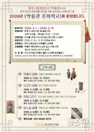 (뉴스핏 = 김수진 기자) 양주시립회암사지박물관은 오는 3월 31일까지 시민들의 문화 향유 기회를 확대하고 문화예술 활동 참여를 활성화하기 위해 상반기 ‘2026 박물관 문화학교’ 수강생을 모집한다.