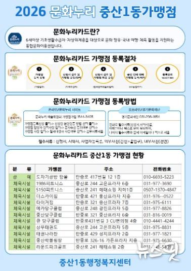 최정원 중산1동장은 “관내 소상공인들에게 문화누리카드 가맹점 등록을 안내해 독거노인, 장애인 등이 가까운 지역에서도 문화누리카드를 사용하는 데 불편을 최소화할 수 있도록 노력하겠다”고 전했다.