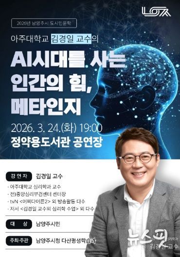 (뉴스핏 = 김수진 기자) 남양주시는 오는 3월 24일 정약용도서관 공연장에서 시민 300여 명을 대상으로 도시인문학 특강 ‘AI시대를 사는 인간의 힘, 메타인지’를 개최한다고 17일 밝혔다.