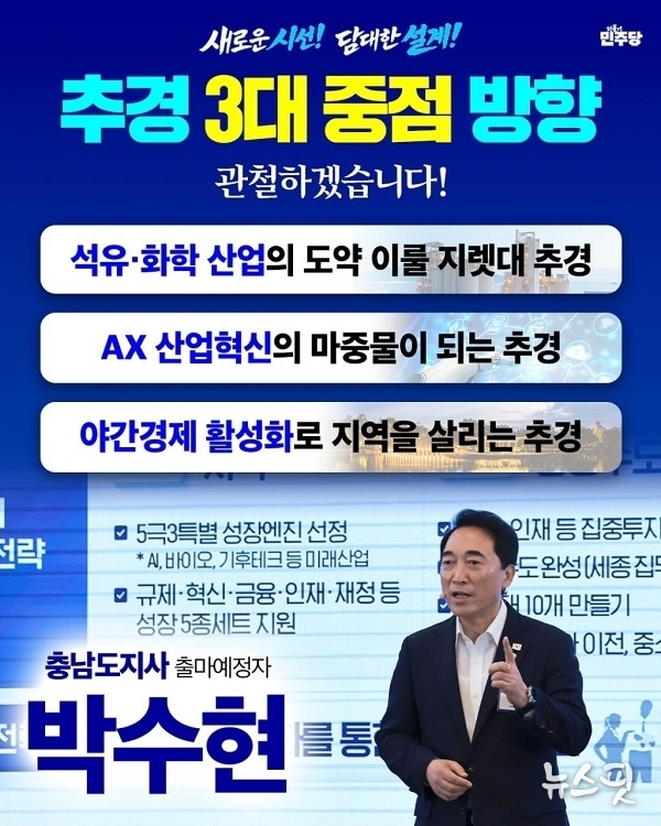 (뉴스핏 = 김수진 기자) 충남도지사 출마를 선언한 박수현 국회의원(더불어민주당 충남 공주·부여·청양)은 17일 “이재명 정부의 추경이 중동發 산업위기 극복과 민생을 위한 추경이 되어야 한다”라며, △석유·화학산업 위기극복 △AX 산업혁신 기반확충 △문화를 통한 야간경제(Night Time Economy) 활성화의 추경 중점추진 3대 방향을 제시했다.