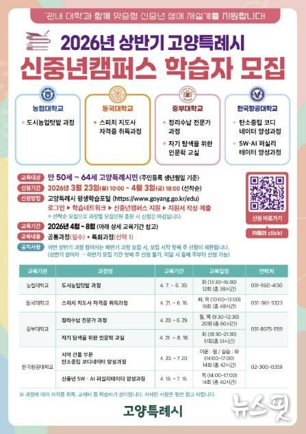 (뉴스핏 = 김호 기자) 고양특례시는 ‘2026년 고양시 신중년캠퍼스’ 상반기 교육과정 학습자 180명을 오는 3월 23일부터 모집한다.