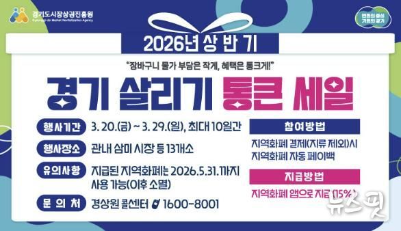 (뉴스핏 = 김수진 기자) 경기 시흥시는 고물가로 위축된 민생경제에 활력을 불어넣고 소상공인의 매출 증대를 돕기 위해 오는 20일부터 29일까지 관내 전역에서 ‘2026년 상반기 경기 살리기 통큰 세일’을 개최한다고 18일 밝혔다.