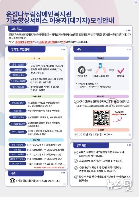 (뉴스핏 = 김호 기자) 파주시 운정다누림장애인복지관은 지역 내 장애인의 기능 향상과 일상생활 능력 증진을 위해 ‘기능향상서비스’참여자를 오는 23일부터 상시 모집한다.