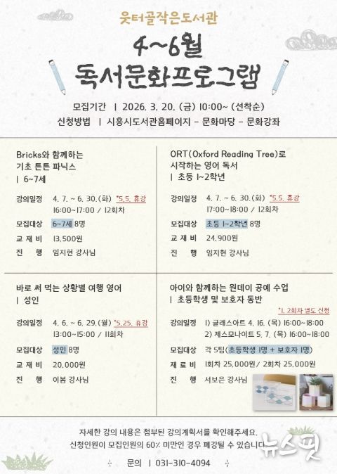 (뉴스핏 = 김수진 기자) 시흥시 은행동에 있는 웃터골작은도서관은 오는 4월 6일부터 6월 30일까지 약 3개월간 상반기 독서문화프로그램을 운영한다고 20일 밝혔다.