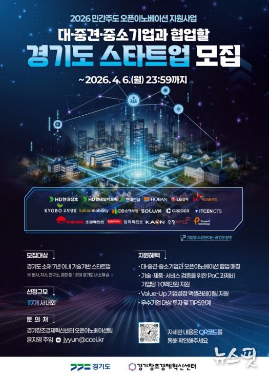(뉴스핏 = 김수진 기자) 경기도와 (재)경기창조경제혁신센터(이하 경기창경센터)는 도내 유망 스타트업의 혁신 성장을 돕고 대·중견기업과의 상생 협력을 도모하기 위해 ‘2026년 민간주도 오픈이노베이션 지원 사업’에 참여할 스타트업을 모집한다.
