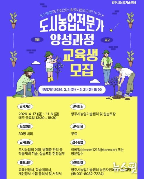 (뉴스핏 = 김호 기자) 양주시는 도시농업 활성화와 전문인력 양성을 위해 오는 3월 31일까지 ‘2026년 도시농업전문가 양성과정’ 제8기 교육생을 모집한다.