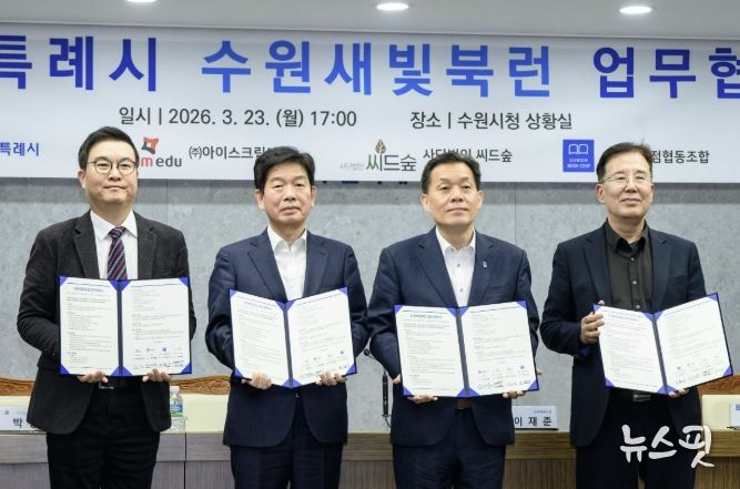 수원시와 ㈜아이스크림에듀, (사)씨드(Seed)숲, 수원시서점협동조합은 23일 시청 상황실에서 ‘수원새빛북런(Book Learn) 업무협약’을 체결하고, 협력을 약속했다.