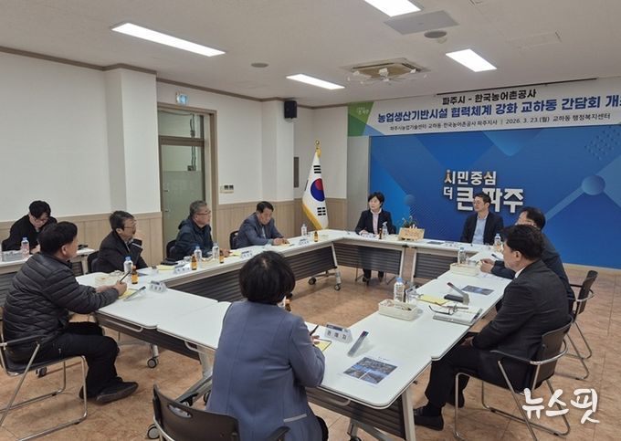 (뉴스핏 = 김호 기자) 파주시농업기술센터는 지난 23일 교하동 행정복지센터에서 한국농어촌공사 파주지사와 함께 농업생산기반시설의 효율적 관리를 위한 협력 방안을 논의하는 간담회를 개최했다.