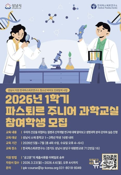 (뉴스핏 = 김호 기자) 성남시는 2026년 상반기 한국파스퇴르연구소 ‘파스퇴르 주니어 과학교실’ 참여 학생을 모집한다고 25일 밝혔다.