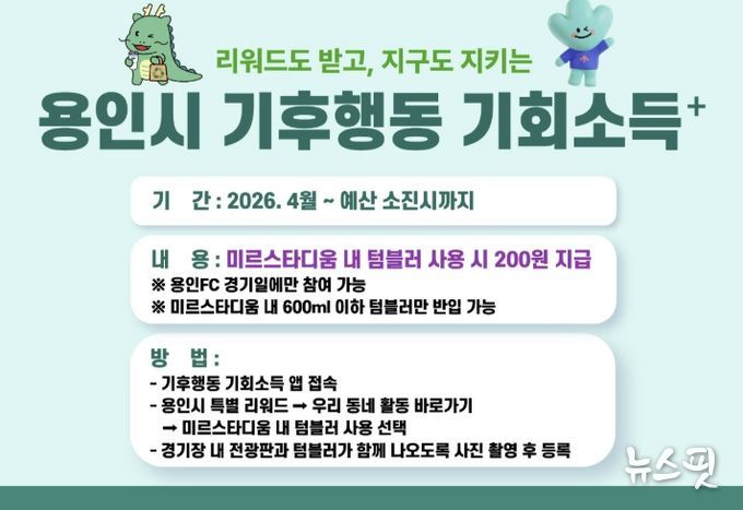 (뉴스핏 = 김수진 기자) 용인특례시는 경기도 ‘기후행동 기회소득’ 사업에 용인시만의 특화 활동을 더한 ‘기후행동 기회소득 플러스’ 사업을 4월부터 운영한다고 1일 밝혔다.