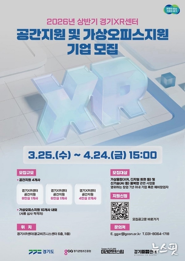 (뉴스핏 = 김수진 기자) 경기콘텐츠진흥원(이하 경콘진)이 ‘2026년 상반기 경기XR센터 공간지원 및 가상오피스지원 기업 모집’을 통해 경기도의 가상 융합 및 신기술 융복합 산업을 이끌 차세대 스타트업 발굴에 나선다.