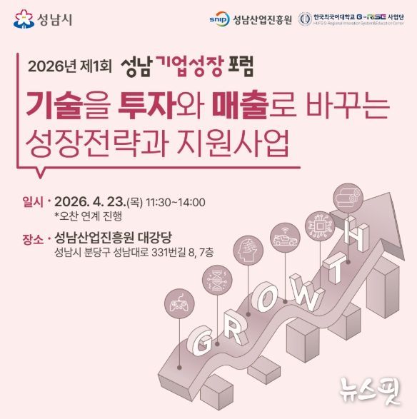 (뉴스핏 = 김수진 기자) 성남산업진흥원은 4월 23일 11시 30분부터 성남산업진흥원 대강당에서 '2026년 제1회 성남기업성장포럼'을 개최한다. 이번 행사는 기술 기반 투자유치와 중동사태 대응 방안을 중심으로 성남 기업의 매출 성장과 글로벌 진출을 모색한다.