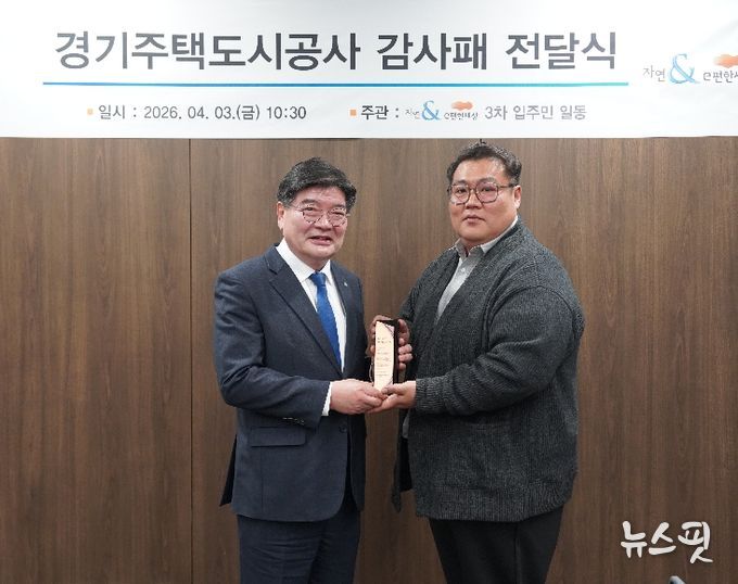 입주민을 대표해 공사를 방문한 김영진 임차인대표회의 회장은 “내 집 마련 여정에서 GH가 든든한 버팀목이 되어주어 깊이 감사드린다”며 김용진 사장에게 직접 감사패를 전달했다.
