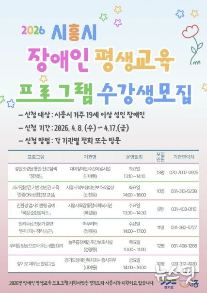 (뉴스핏 = 김수진 기자) 시흥시가 관내 성인 장애인의 학습권 보장과 사회참여 확대를 위해 ‘2026년 장애인 평생교육 프로그램 지원사업’을 본격적으로 시작하며, 8일부터 17일까지 프로그램 운영을 위한 학습자를 모집한다고 밝혔다.