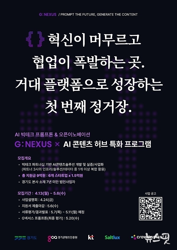 특히 오는 24일 열리는 사업 설명회에서는 3개 파트너사가 직접 참석해 구체적인 협력 방안을 제안하고 세부 모집 및 선정 절차를 안내할 예정이다. 또한 경콘진은 이번 설명회에서 교육, 제작, 투자 등 진흥원의 다양한 AI 지원 사업을 아우르는 통합 브랜드 ‘G:넥서스(G:NEXUS)’를 공식 발표하며 대한민국 AI 콘텐츠 산업을 선도하겠다는 비전을 공유한다.