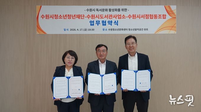 (뉴스핏 = 김호 기자) 수원시청소년청년재단은 수원시도서관사업소, 수원시서점협동조합과 4월 17일 수원청소년문화센터에서 수원시 독서문화 활성화를 위한 업무협약을 체결했다.