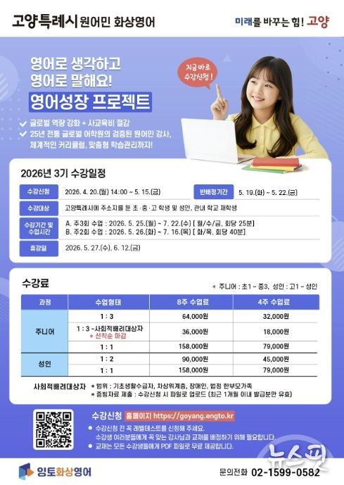 (뉴스핏 = 김호 기자) 고양특례시는 글로벌 역량 강화와 사교육비 부담 완화를 위한 ‘원어민 화상영어’ 프로그램의 3기 수강생을 4월 20일부터 5월 15일까지 모집한다.