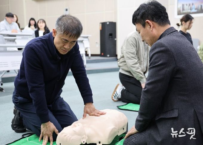용인시 처인구보건소와 협력해 진행된 이번 교육은 각 사업장 내 응급상황 발생 시 초기 대응을 맡게 되는 AED 관리책임자 30여 명이 참여했다. 특히 용인도시공사 신경철 사장이 교육 현장을 찾아 직원들과 함께 심폐소생술 실습에 직접 참여하며 안전의식 확산에 힘을 보탰다.