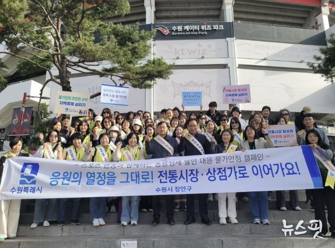 (뉴스핏 = 김호 기자) 수원시 장안구는 지난 22일, 수원KT위즈파크 일대에서 야구관중을 대상으로 지역경제 활성화를 위한 캠페인을 추진했다. 이번 캠페인에는 장안구청장을 비롯해 관계 공무원과 물가모니터요원 등 20여 명이 참여했다.