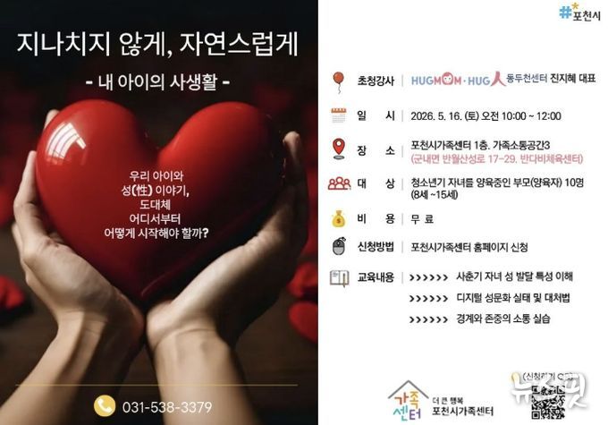 (뉴스핏 = 김호 기자) 포천시 직영 더 큰 행복 포천시가족센터는 오는 21일부터 사춘기 자녀를 둔 양육자를 대상으로 부모 교육 프로그램 ‘지나치지 않게, 자연스럽게’의 참여자를 모집한다. 이번 교육은 5월 16일 오전, 포천시가족센터 가족소통공간(반다비체육센터 1층)에서 대면 강의로 진행된다.