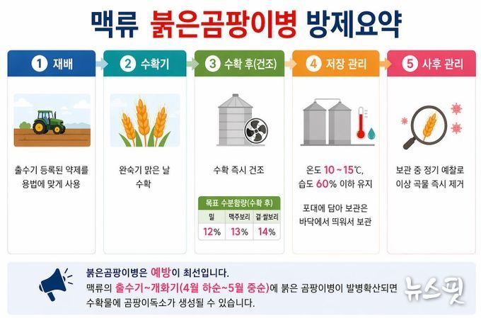 (뉴스핏 = 김호 기자) 이천시는 맥류의 본격적인 출수기(40%출수) ~ 개화기(출수 후 5~10일)를 맞아 붉은곰팡이병 방제를 당부한다고 23일 전했다. 최근 봄철의 기온상승과 강우량의 상황에 따라서 맥류의 붉은곰팡이병 방제 중요성을 강조했다.